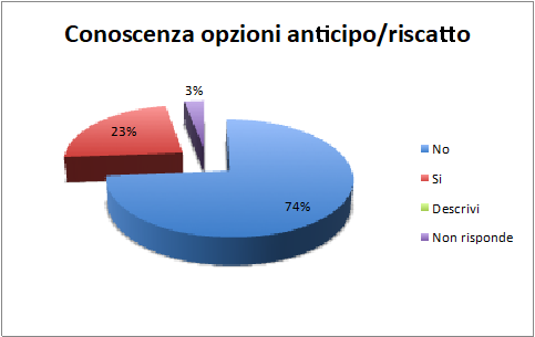 Analogamente emerge una conoscenza abbastanza limitata di quelle che sono le opzioni per chiedere l’anticipo/riscatto, dato che il 74% degli iscritti indica di non conoscerle. Del 23% che dice di conoscerle, solo alcuni le menzionano tutte, i più indicano l’acquisto 1° casa, pochi solo gli altri motivi, un paio di rispondenti richiama la Rita e il 50%.